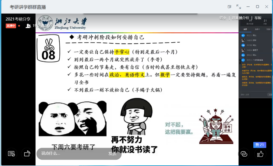 通过本次的讲座由浅入深的讲解,同学们对于考研初试和微积分学科的复习方法都有了些初步的认识,同时也认识到了考研成功并不能算是一个十分遥远的东西,而是一个通过自己的努力和技巧以及长时间的坚持才能够到达的目标。万事开头难,望大家能在考研的竞争当中取得满意的成绩。