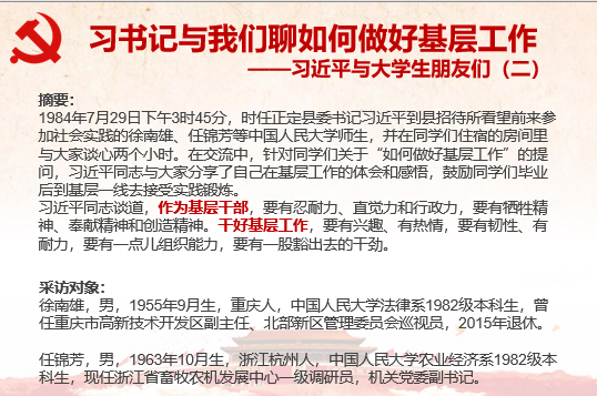 之后,集体学习“习书记与我们聊如何做好基层工作”内容:1984年7月29日下午3时45分,时任正定县委书记习近平到县招待所看望前来参加社会实践的徐南雄、任锦芳等中国人民大学师生,并在同学们住宿的房间里与大家谈心两个小时。在交流中,针对同学们关于“如何做好基层工作”的提问,习近平同志与大家分享了自己在基层工作的体会和感悟,鼓励同学们毕业后到基层一线去接受实践锻炼。习书记告诉我们,干好基层工作要做到四点。一是要有兴趣、有热情,这是基础。他说他到了正定以后,虽然忙,矛盾层出不穷,但感觉很充实,很乐意与各种矛盾斗争,也没有克服不了的困难。这种繁忙已经成为生活的乐趣。二是要有韧性、有耐力,要作好长期艰苦奋斗的准备。三是要有一点儿组织能力,这种能力主要靠后天锻炼出来。四是要有一股豁出去的干劲,不但每天要花大量时间工作,而且要敢于负责,大胆创新,不要怕丢官。