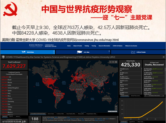 接下来,党支部副书记给全体党员上迎“七一”主题党课——“中国与世界抗疫形势观察”。国务院新闻办公室7日发布《抗击新冠肺炎疫情的中国行动》白皮书,对中国政府在应对新中国成立以来发生的这次最严重的突发公共卫生事件中的有效经验进行了梳理和总结。6月10日出版的 《俄罗斯报》在《中俄锐评》专栏用半版篇幅刊发题为《中国发布白皮书与世界分享抗疫成功经验》的述评文章,报道了白皮书的重要意义。白皮书通过详实的数据梳理了中国战“疫”成功经验,强调了中国秉持“生命至上”理念,在应对重大突发公共卫生事件中所展现的大国责任与担当。文章指出,团结合作是战胜疫情的最有力武器。中国呼吁国际社会反对污名化和疫情政治化,共同构建人类卫生健康共同体。截至目前,中国有效阻止了新冠病毒传播的所有渠道,将病亡率控制在 5.6% 的较低水平。