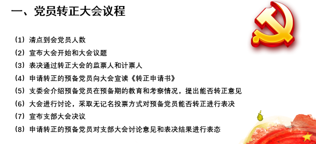 首先清点了到会党员人数。支部一共有15名党员,本次大会参与学生党员人数有15人,超过了总人数的2/3,符合要求,主持人宣布大会开始和大会议题,并表决通过本次转正大会的计票人、监票人分别为:童希、朱文斌。申请转正的预备党员韦逍遥同志宣读了转正申请书,汇报自己在预备期间的表现,肯定成绩,找出缺点和不足,表明了自己的态度和决心。