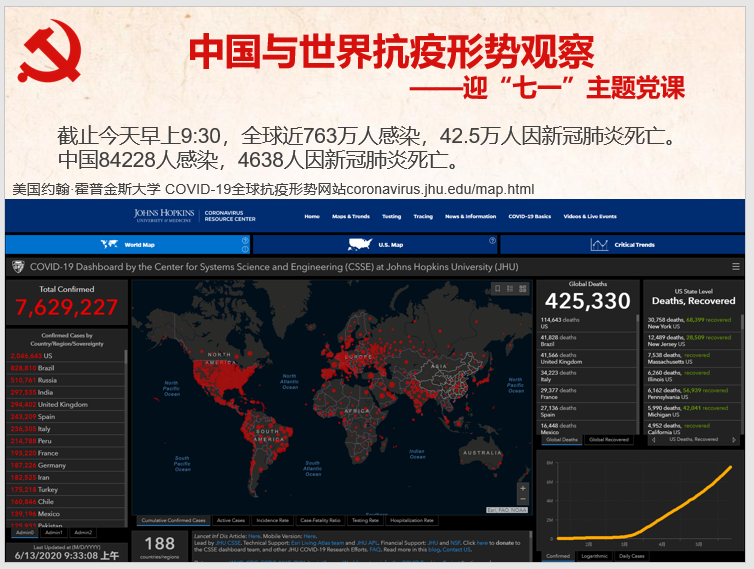 党支部副书记王昱涛为全体党员上迎“七一”主题党课——中国与世界抗疫形势观察。截止2020年6月13日早上9:30,全球近763万人感染,42.5万人因新冠肺炎死亡。中国84228人感染,4638人因新冠肺炎死亡。