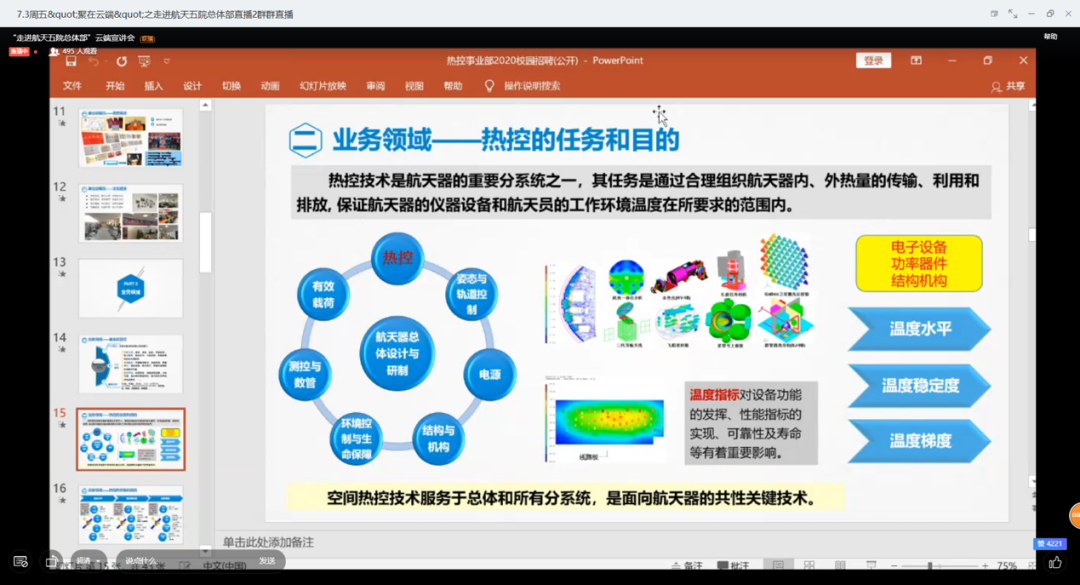 热控事业部高级工程师潘维学姐毕业于浙江大学能源工程学院,她主要介绍了五院总体部热控事业部的情况,包括热控事业部的概况及其涉及的业务领域——热控的任务和目的、宇航主业,最后介绍了热控事业部的多种职业发展通道。
