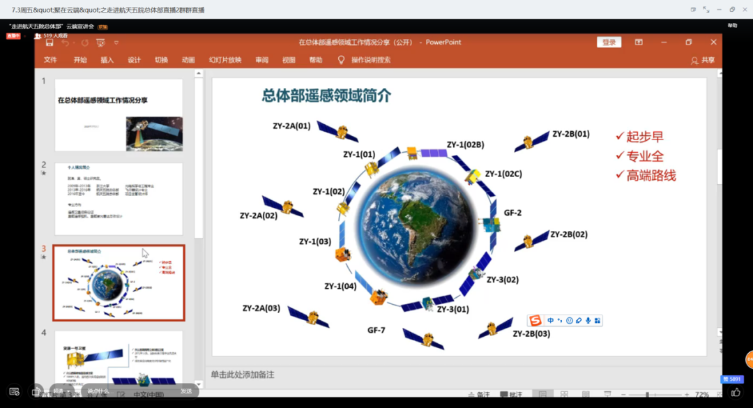 7月3日下午14:00,“走进航天五院总体部”浙大专场云端报告会暨‘先锋学子’全员培训第二十一次培训成功举办。本次活动通过钉钉直播的形式举办,由浙江大学就业指导与服务中心主办,浙大电气工程学院承办,GFJG就业指导战略平台、重点国企央企就业指导战略平台全体成员单位协办,旨在帮助同学们进一步了解航天科技集团五院总体部。本次活动吸引了近700余位校内外同学加入直播群聊,其中共有498名浙大学子在线观看直播,点赞数达10000余次。