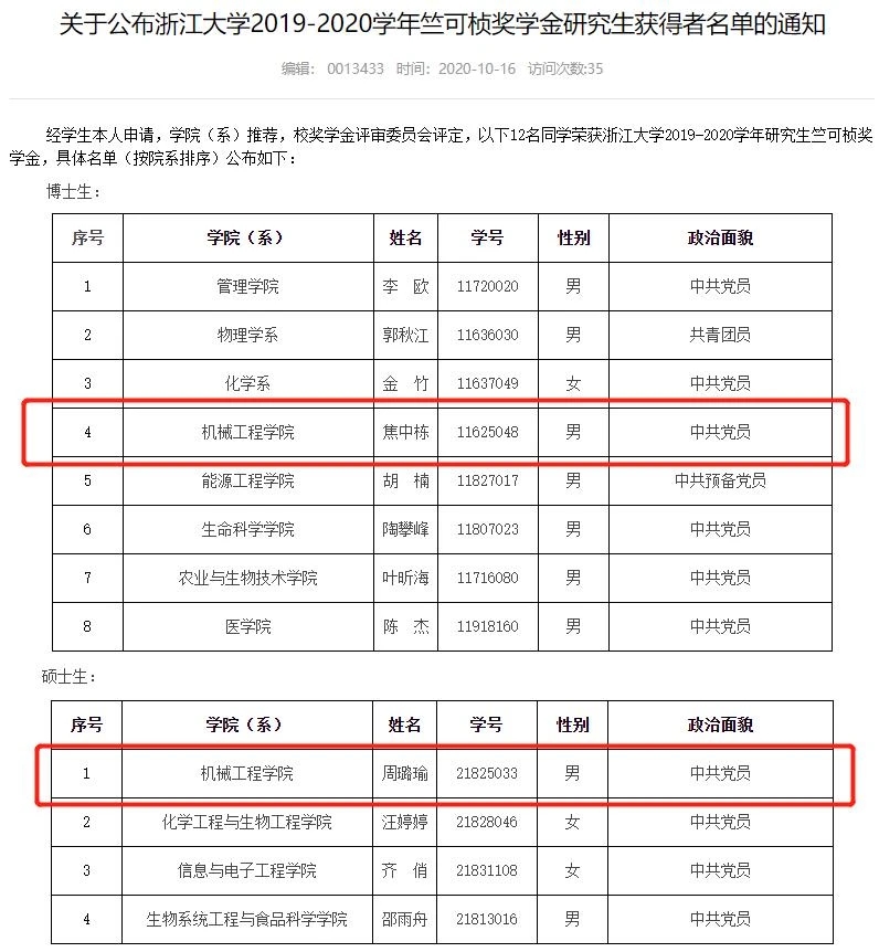 经浙江大学奖学金评审委员会评定,我院博士生焦中栋(导师:邹俊)、硕士生周璐瑜(导师:贺永),17级工业工程本科生章贝宁荣获2019-2020学年竺可桢奖学金!学院本科、硕士、博士同时获得该奖项,取得了大满贯,实现了新突破!浙江大学自1986年起设立的竺可桢奖学金,是学校最高层次的奖学金,全校每年仅评选12名本科生、12名研究生。特此向荣获竺可桢奖学金的三位同学及其导师表示热烈祝贺!