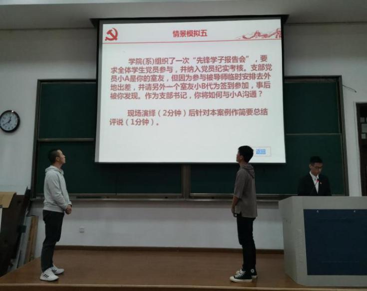 进入情景模拟环节,各支部书记从屏幕上抽取情景主题,在助演嘉宾的配合下模拟在支部工作中遇到的各种情况,并进行临场发挥,此环节考验了书记们的应变能力、理论功底和党务处理能力,同样也体现出书记们对于党员的关怀程度和责任意识。例如王越同志对考核失败的积极分子进行开导,既帮助该同志端正了态度,又让他树立起自信心,走出了自责和低落的情绪;任奇同志对档案丢失的同学进行细心的解释,稳定了该同学的情绪,并引导他对这一情况端正态度……整个过程妙趣横生,在带给观众们欢乐的同时也给书记们带来了思考和感悟。