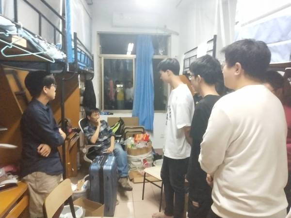 10月10日晚上21:15由团支书来各寝室通知各班级成员前往一个寝室以方便班主任与同学们展开交流与问候。
