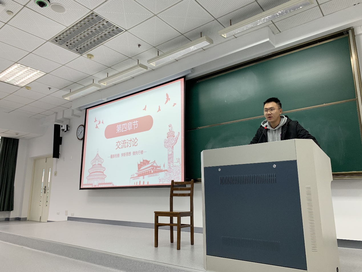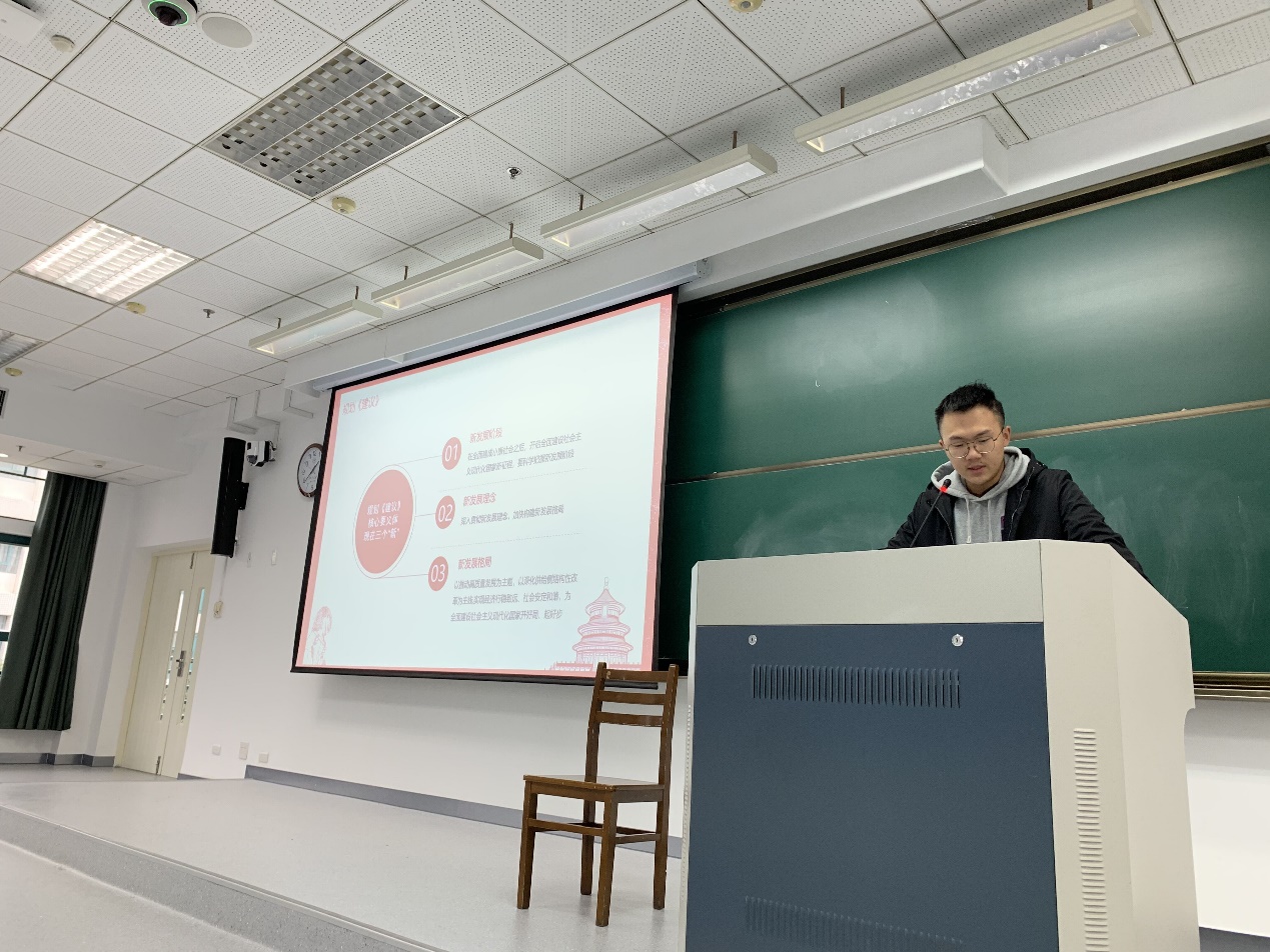 机械工程1906团支部团支书石大杭同学为我们讲述规划《建议》的突出特点,就是紧紧抓住我国社会主要矛盾,从各个领域提出一系列战略性、创新性举措。规划《建议》的核心要义体现在新发展阶段、新发展理念、新发展格局的三个“新“。