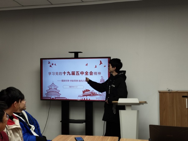 会议正式开始后,为学习贯彻党的十五届五中全会精神,安亮同学介绍道,“党的十九届五中全会,是在我国将进入新发展阶段、实现中华民族伟大复兴正处在关键时期召开的一次具有全局性、历史性意义的重要会议”。在宣讲过程中,他从全会公报、规划《建议》两个角度介绍了第十九届五中全会的精神内容和历史影响,并活用央视视频,在短短几分钟之内,多方位多角度地展示了会议核心所在,全面分析我国社会主要矛盾变化带来的新特征、新要求和全面分析错综复杂的国际环境变化带来的新任务、新挑战,回顾过去,展望未来。