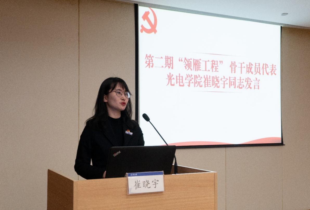 随后,光电学院崔晓宇同学作为“领雁工程”第二期骨干成员代表发言,回忆了自己的入党动机和入党旅程,分享了自己作为党支部书记,参与“领雁工程”获得的成长与感悟。同时,她号召所有党支部书记珍惜此次学习机会,提高思想站位,明确角色定位,守牢学生本位。