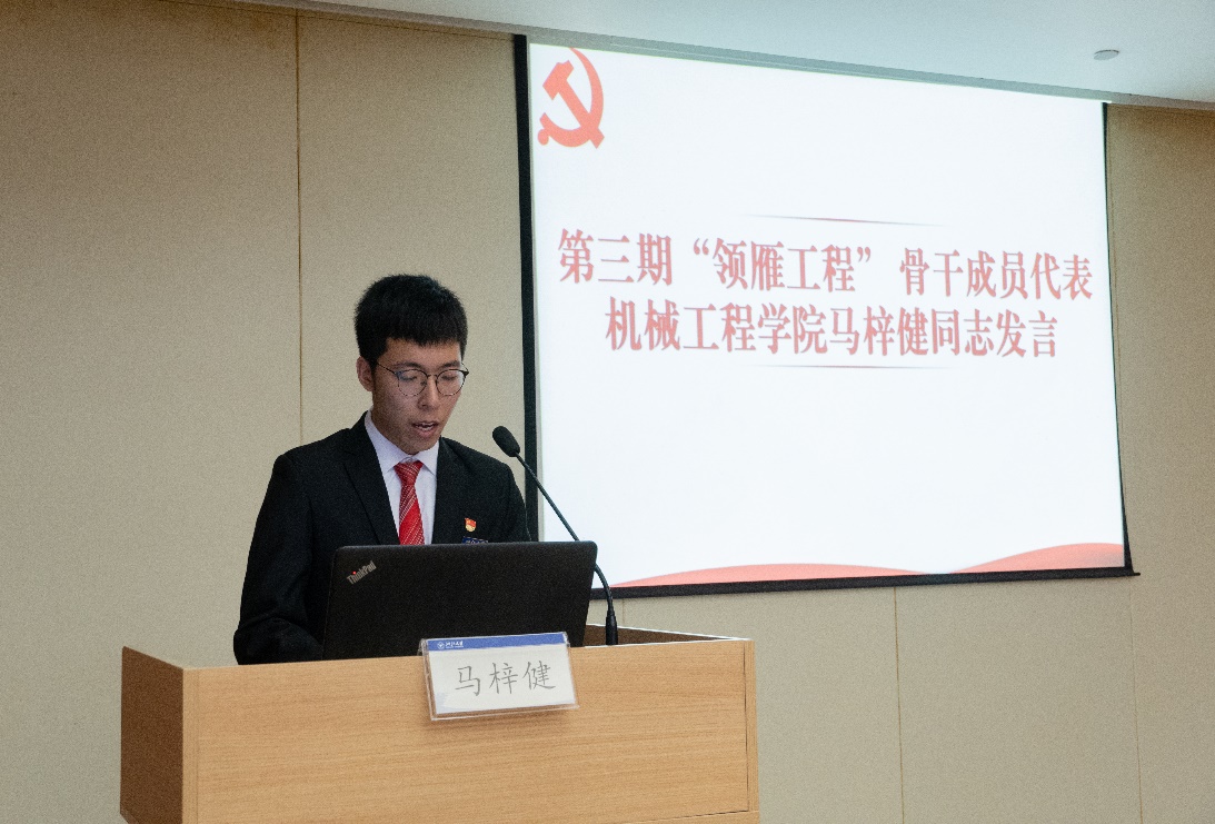 来自机械工程学院硕士研究生第一党支部的马梓健同学作为“领雁工程”第三期骨干成员代表发言。他号召各位研究生党支部书记利用参加此次“领雁工程”的学习机会,努力提高自己岗位所需的思想境界和能力素质,谈认识、找差距、调思路、定措施,以实际行动彰显使命担当,努力成长为一名新时代合格的研究生党支部书记,做求是创新的弘扬者、做胸怀天下的逐梦者。