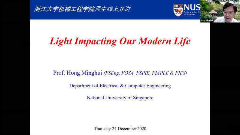 2020年12月24日,应浙江大学机械工程学院邀请,新加坡工程院院士洪明辉教授为我院师生举行线上学术讲座,进行了题为“Light Impacting Our Modern Life”的精彩学术报告。讲座由我院徐凯臣研究员主持,学院近100名师生参与了本次讲座。