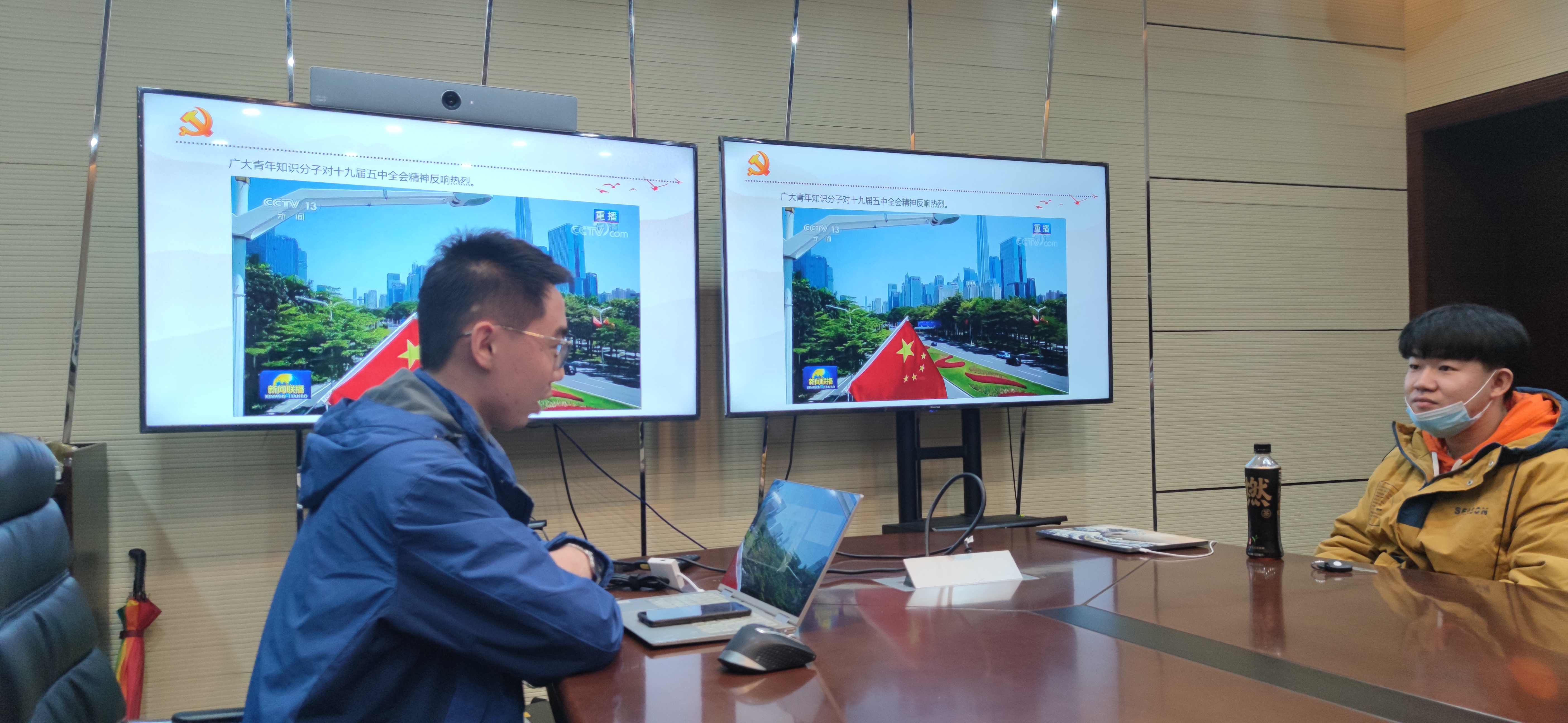 首先,我们播放了两段由央视新闻播出的十九届五中全会相关视频。视频分别提到了创新的核心地位、广大青年知识分子对大会精神的响应,这与我们研究生党员息息相关。看完这些视频,支部的党员纷纷表示要认真学习十九届五中全会的精神,并将会议精神落实到日常科研、工作和生活中。