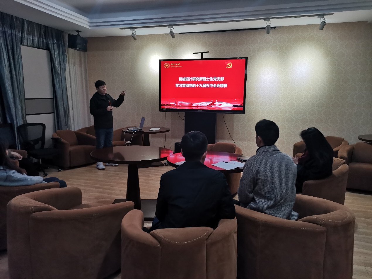 2020年10月26日至29日,中国共产党第十九届中央委员会第五次全体会议在京隆重举行,习近平总书记发表重要讲话。全会审议通过了《中共中央关于制定国民经济和社会发展第十四个五年规划和二〇三五年远景目标的建议》。全会号召,全党全国各族人民要紧密团结在以习近平同志为核心的党中央周围,同心同德、顽强奋斗,夺取全面建设社会主义现代化国家新胜利。为了深入贯彻和学习第十九届五中全会精神,浙江大学机械设计博士生党支部开展党课学习活动,会议由机械设计博士生党支部书记尚冰洋主持。