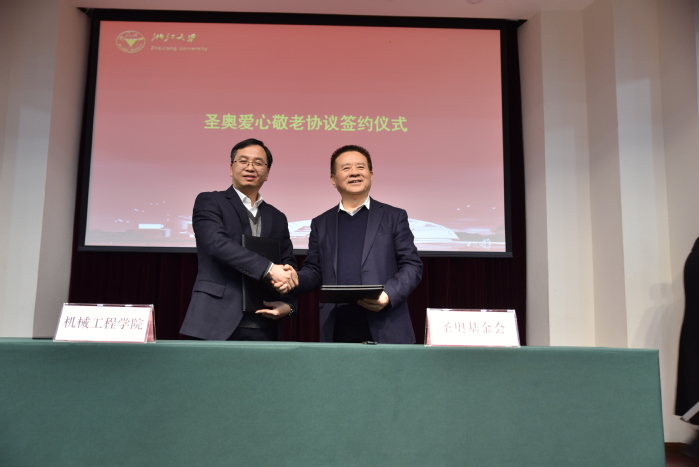 接着,进行了圣奥爱心敬老协议签约仪式。郑明治会长和梅德庆书记分别代表圣奥慈善基金会和浙江大学机械工程学院进行了签约。浙江圣奥慈善基金会长期关心和支持机械学院的发展,此次再次为学院设立了爱心敬老基金,用以专项支持学院离退休教职工活动。