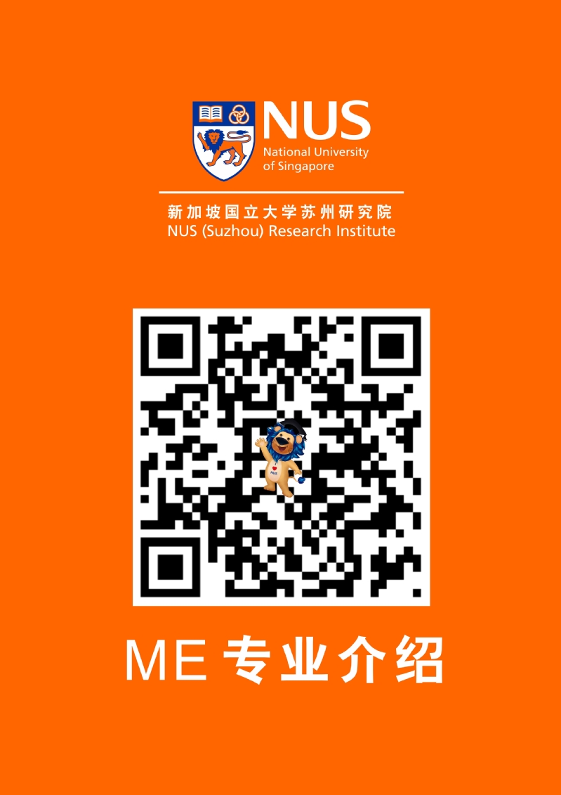 选拔有良好学术基础的大三学生,入选者大四期间在新加坡国立大学苏州研究院度过一年的过渡期,成为第一个“+1”年。在这一年中主要研习英语读写、沟通能力以及机械领域的知识,为硕士申请做准备,同时可将第一年相关课程转换为浙江大学相应课程学分,顺利通过者将获得浙江大学学士学位。第二个“+1”年,入选者在通过第一年学业,符合条件后,申请前往新加坡国立大学机械系攻读授课型硕士。可扫码了解专业介绍: