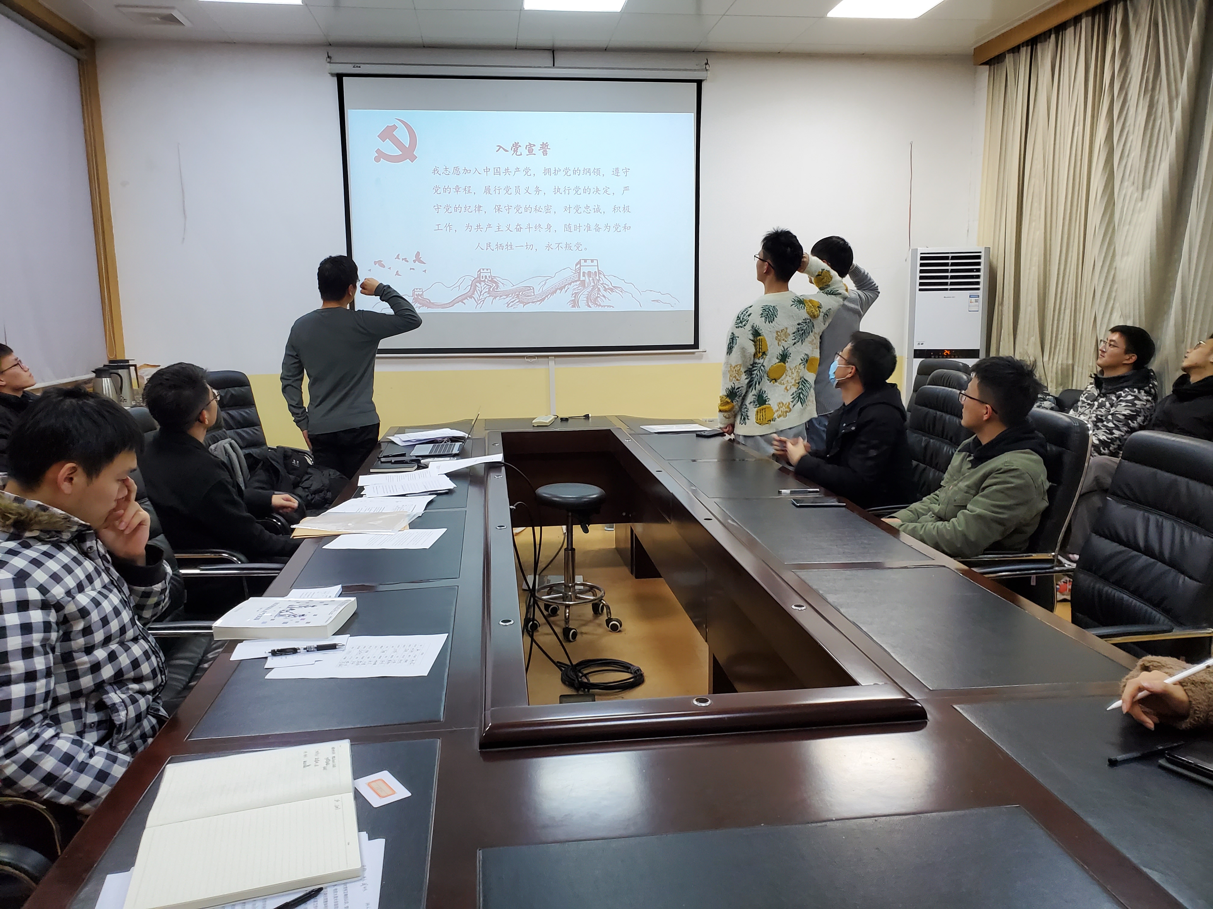 会议最后,两位预备党员进行入党宣誓,其他党员重温入党誓词,在清晰而又坚定的宣誓声的回响中,誓词再一次铭刻在每一个在场的人的心中,因为共同目标的凝聚,支部也拥有了更强的团结力量。