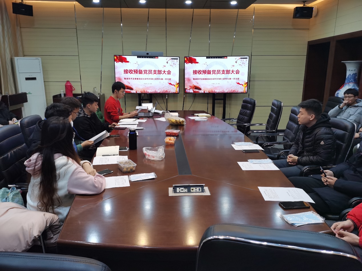 2021年1月25日晚,制造技术及装备自动化研究所硕士研究生第一党支部,于第一教学大楼411会议室举行党员发展大会。会议由马梓健同志主持,与会党员充分讨论贾宇寒、卢星晨两位发展对象的发展事宜。