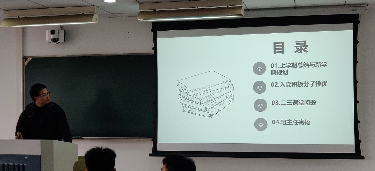 班会分为四个版块:学期总结与规划、入党积极分子推优、二三课堂问题与班主任寄语。