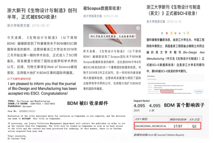 BDM期刊相继被ESCI、Scopus、EI、SCIE等多个国际知名数据库收录。BDM于2018年3月创刊,于2019年12月就被SCI-E收录,被划分在JCR的ENGINEERING BIOMEDICAL分库;2020年获得首个影响因子4.095,以分区17/87位列JCR Q1,成为浙大唯一一本进入SCI Q1分区的期刊,在国内SCI期刊中位列54/256,预测今年的影响因子将达到6.09分(截至 2021年3月30日WoS数据)。