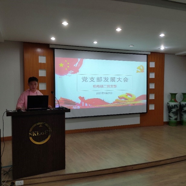 2021年3月21日晚19:00,机电硕二党支部于液压老楼四楼会议室举行了党支部党员发展大会,会议主要讨论支部杨宇柱同志、王智聪同志两位发展对象的发展入党事宜。本次会议由支部书记戴宇佳同志主持,共有18名党员参加本次会议。