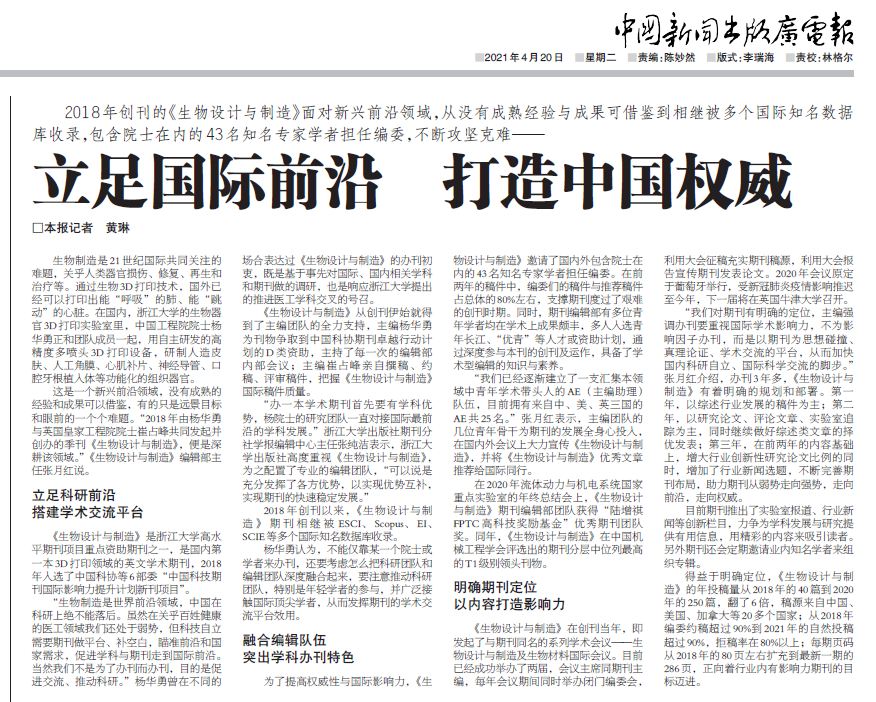 中国新闻出版广电报于2021年4月20日刊发《立足国际前沿 打造中国权威》,报道了我院杨华勇院士和英国皇家工程院院士牛津大学崔占峰院士为共同主编创办的《生物设计与制造》,该刊物不仅填补了国际上3D生物打印&制造领域内中国期刊的空白,也将填补国际生物3D打印技术在设计制造方面的空白,提升中国在该领域的国际影响力和话语权。
