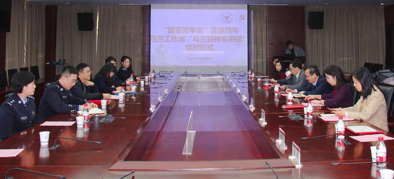 2021年4月9日上午,浙江大学马兰工作室“马兰精神”宣讲团与浙江省国安厅牵头的“国安青年说”宣讲团结对仪式在浙江大学先进技术研究院举行。省国安厅宣教处处长胡骏,副处长蒋文栩,团委专职副书记马宇翔,浙江大学先进技术研究院直属党总支书记、副院长金钢,机械工程学院党委书记梅德庆,副书记项淑芳,党政办主任闫小龙,团委书记王芳官等共同参加结对仪式,仪式由项淑芳主持。
