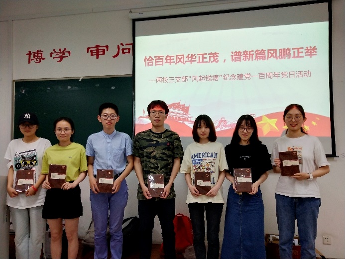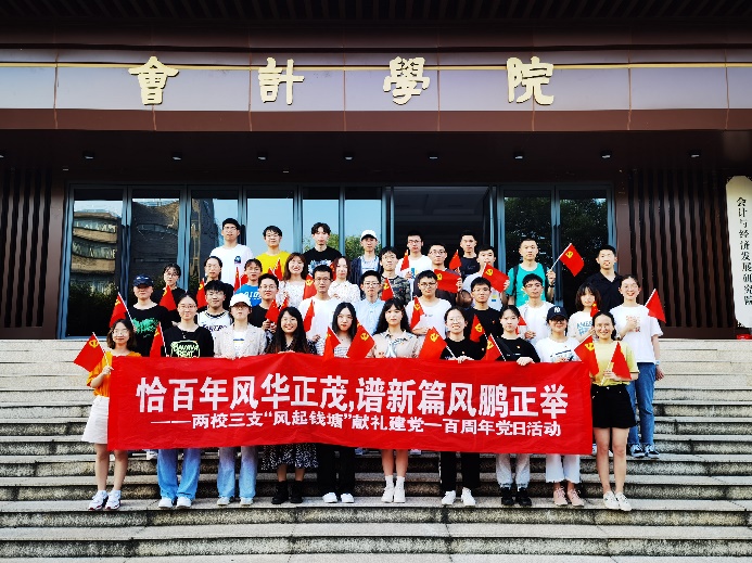 为纪念建党一百周年,深入开展党史学习教育,进一步推动广大党员坚定理想信念,在实践中学党史、悟思想,2021年5月31日,浙江大学机械工程本科生第一党支部前往浙江财经大学下沙校区,与浙财会计学院学生第一党支部和第二党支部共同举办两校三支部“风起钱塘”纪念建党100周年党日主题活动。
