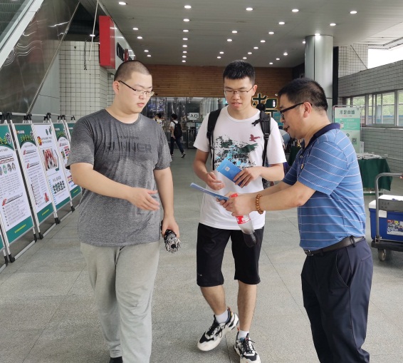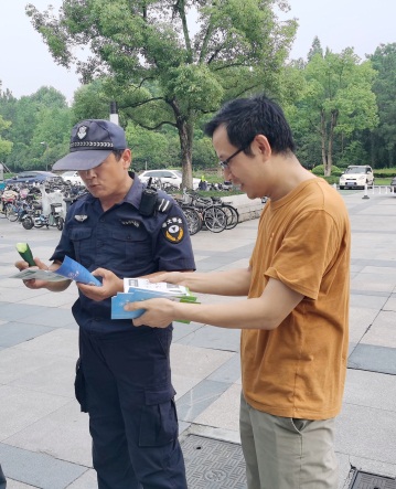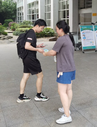 下午的文化广场天气炎热,支部同志们分散在食堂前、超市里、广场上,主动为路过的老师和同学们送上《垃圾分类指导手册》等资料,热情讲解垃圾分类等环保知识,为环保宣传尽心尽力。