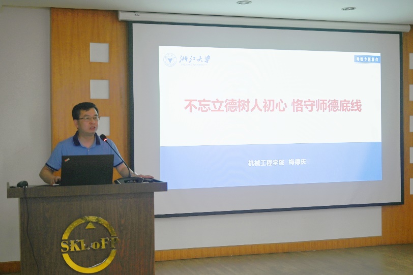 学院党委书记、我支部结对党员领导干部梅德庆教授做题为“不忘立德树人初心,恪守师德底线”的专题报告。从习近平总书记对高校教师的期望与定位切入,重点阐述了新时代背景下师德师风建设的方位,强调要时刻心怀理想信念、秉承道德情操、培养扎实学识、怀揣仁爱之心。同时,梅书记带领教职工同志们系统了解了党中央出台的高校师德师风建设工作有关文件,深入解读了《新时代高校教师职业行为十项准则》,让师德师风的重要性深入人心。另外,梅书记也提出“师德师风建设有很大成效,但依然存在短板弱项”,唯有各位老师时刻心怀警钟,不负习近平总书记对浙大教师殷切期盼,为实现中华民族伟大复兴的中国梦源源不断培养和造就一代又一代社会主义事业的合格建设者和可靠接班人。