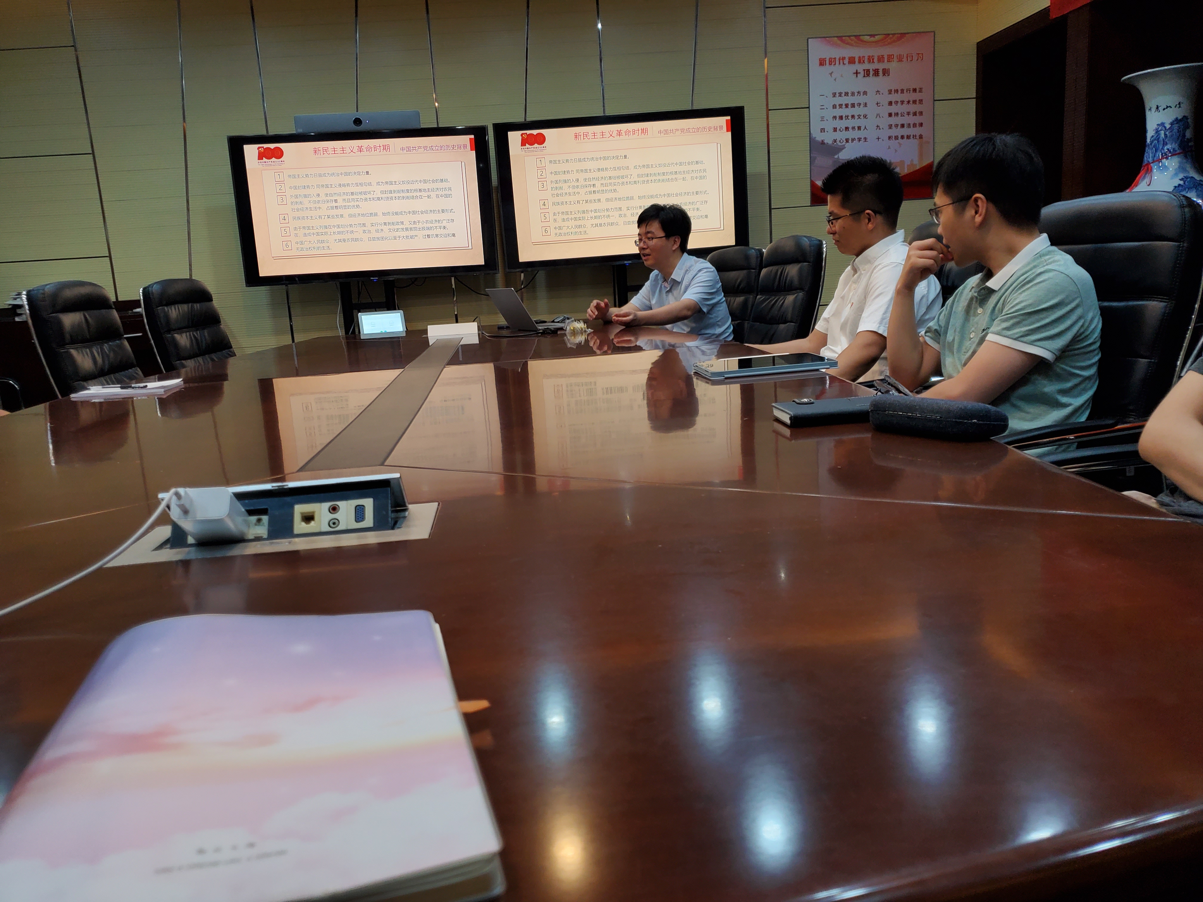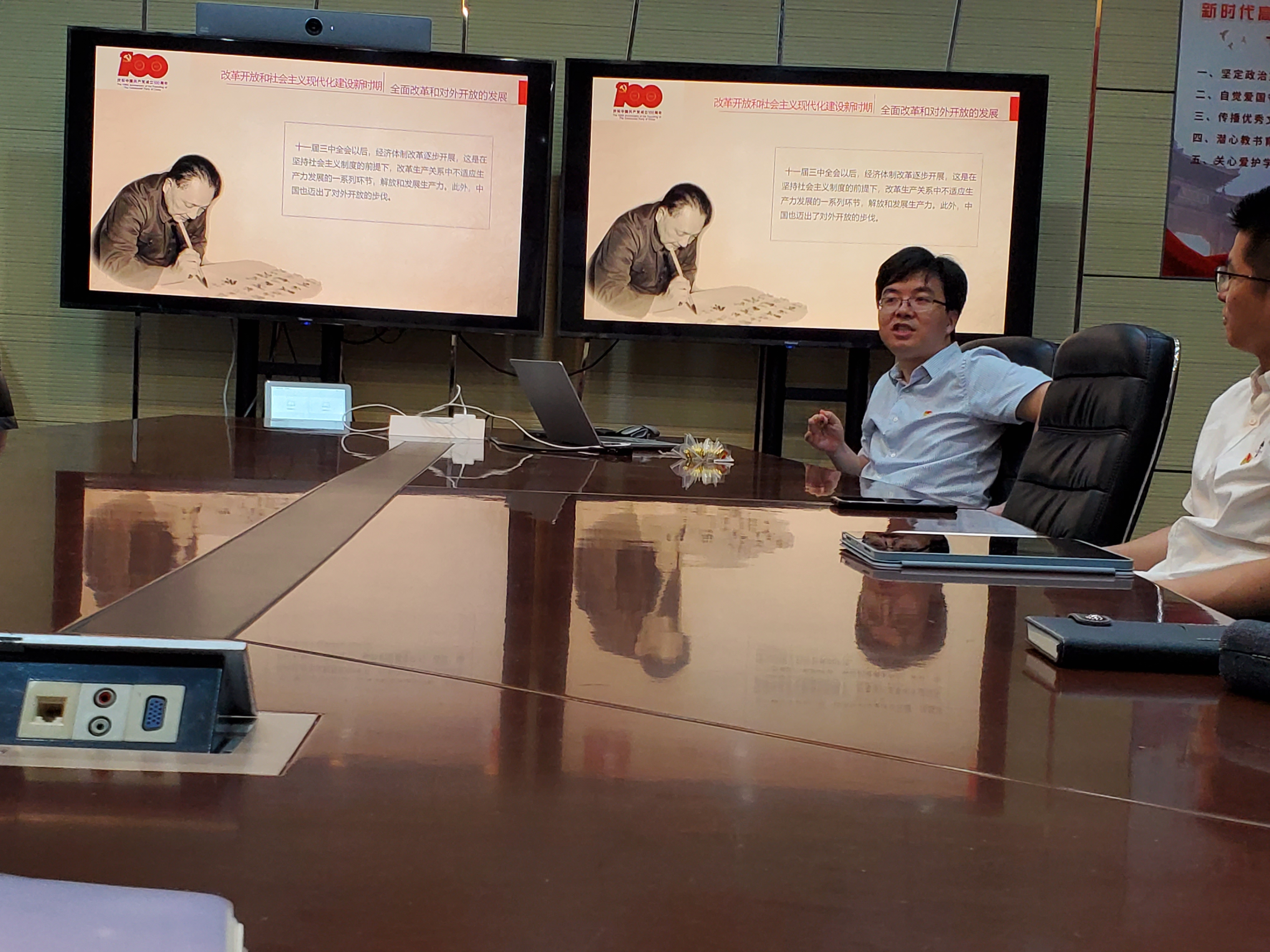 第一部分是新民主主义革命时期。从中国共产党成立的历史背景讲起,提到了新文化运动、五四运动、中共一大等代表性事件。尤其讲到了毛主席的作品,并倡导党员多多研读毛主席的著作,学习大局思维,要顺潮流而动。