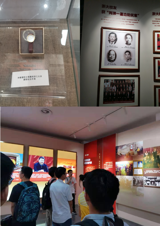 下午两点半,两支部首先来到了浙江大学校史馆。整个展览共有“求是溯源”、“探求崛起”、“调整发展”“争创一流”四个重要发展时期的展厅场景,整个展览以550余幅照片、120多件校史文物,真实生动地再现了浙江大学跨越三个世纪、沧桑而绚烂的百年发展历程。在讲解员的耐心细致讲解下,我们详细地学习了“文军长征”——浙大人在竺可桢校长率领下,怀着“教育救国,科学兴邦”理想进行的四次西迁历史的优秀典型和事迹,我们感受到了求是精神的诞生和现如今幸福学习环境的来之不易。之后,我们也具体学习了学校的四位“两弹一星”功勋奖章获得者:钱三强、赵九章、王淦昌、程开甲,以及两弹一星事业中的功臣林俊德院士、贺贤土院士、唐茗威院士等伟大前辈的事迹,号召新时代的学生党员牢记“两弹一星”精神这一伟大精神财富。