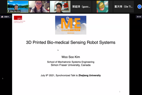 为开拓学生国际视野,培养具有全球竞争力的高素质人才,浙江大学机械工程学院于2021年7月9日邀请西蒙弗雷泽(SFU)机电系统工程学院代理院长Prof. Woo Soo Kim教授为我院师生举行线上学术讲座,进行了题为“3D Printed Bio-medical Sensing Robot Systems”的精彩学术报告。本次讲座由杨赓研究员主持,136名师生线上参加。