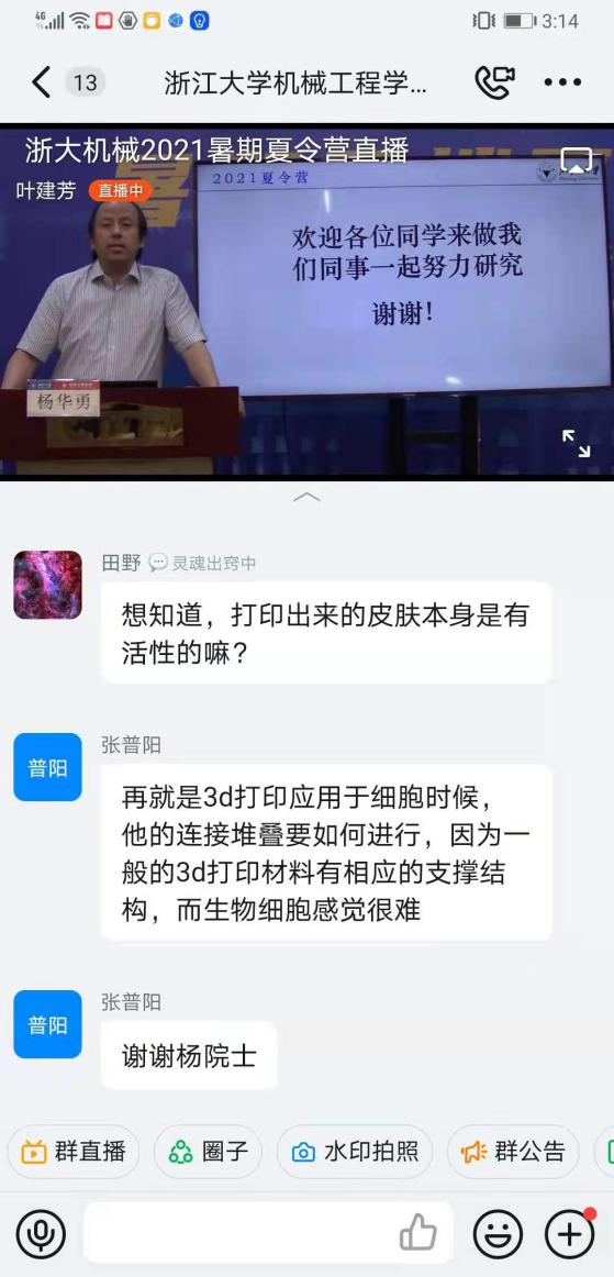 线上的形式也阻挡不了学生们的交流热情,对几位老师介绍的内容踊跃提问,对杨华勇院士学术报告中提到的生物3D打印技术尤其关注。此外营员对于博士待遇、毕业时间和去向等进行了提问,刘振宇教授一一解答,现场交流气氛热烈,同学们均表示受益良多。