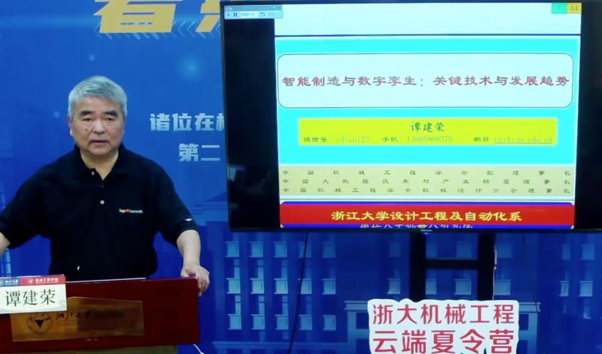 开营仪式结束后,机械工程学院的专家教授们为各位同学带来了四场不同主题的学术报告会。当天上午,谭建荣院士为同学们做了题为《智能制造与数字孪生:关键技术与发展趋势》的学术报告,主要介绍了智能制造的内涵、数字孪生的八大关键技术,并以汽轮机、汽车发动机等为例介绍了典型的应用场景。随后,飞机数字化装备领域科研团队的董辉跃教授作了题为《飞机数字化装配与复合材料自动铺放》的学术报告,从飞机领域的三大国际难题入手,介绍了浙大机械大飞机团队取得的系列进展,开发的机器人装备全面应用于国内各大主机厂;随后对复合材料自动铺放有关的技术研究和装备开发进行介绍,并欢迎同学们加入大飞机团队。