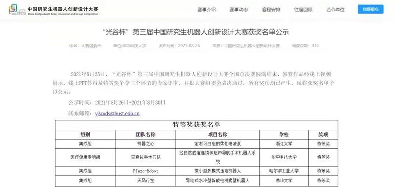 2021年8月25日,“光谷杯”第三届中国研究生机器人创新设计大赛全国总决赛在华中科技大学结束,浙大学子在决赛表现突出,取得了新的突破,斩获全国特等奖1项,一等奖1项,二等奖1项,三等奖3项,浙江大学获得“优秀组织单位”荣誉称号。