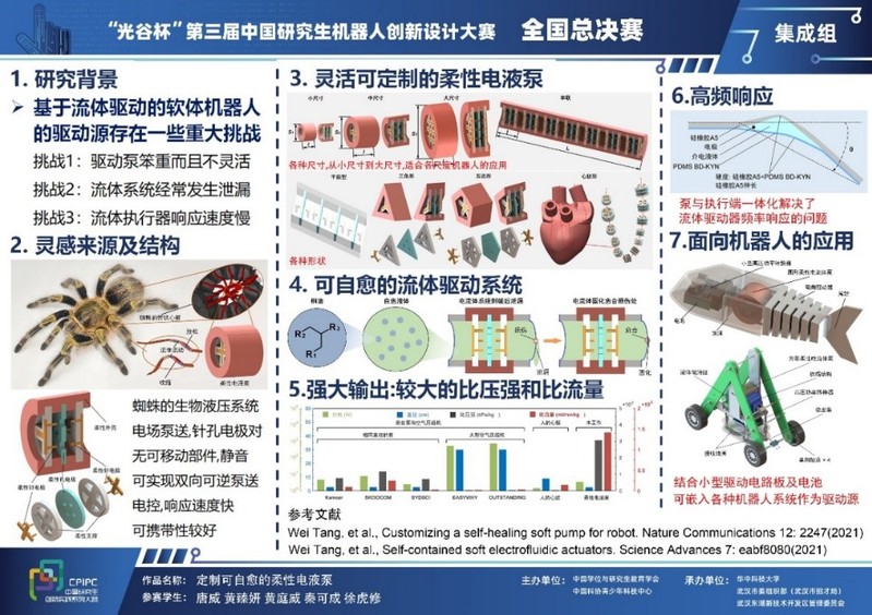其参赛作品内容是面向机器人应用的柔性电液泵和柔性电液执行器,该工作提出一种可自愈的柔性电液泵,其基本工作原理是基于柔性针孔电极对构建的非均匀电场实现介电液体的泵送。该电液泵驱动没有声音,可实现可逆的双向泵送,并且可以灵活地定制,适合各尺度机器人应用。柔性电液泵泵送的液体中加入了桐油这种自愈因子,它遇到空气可以固化成膜,可实现机器人破损后的自修复。将柔性电液泵嵌入执行器实现一体化,可实现柔性流体执行器的高频输出,其最大的响应频率可到30Hz。