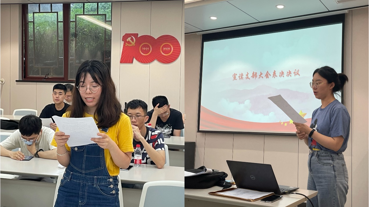 图注:组织委员报告审查情况(左)及支部书记宣读表决决议(右)