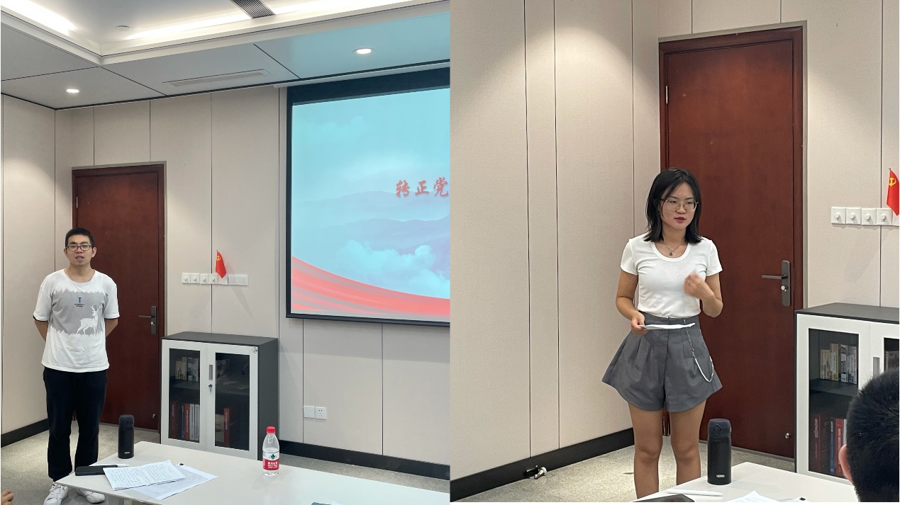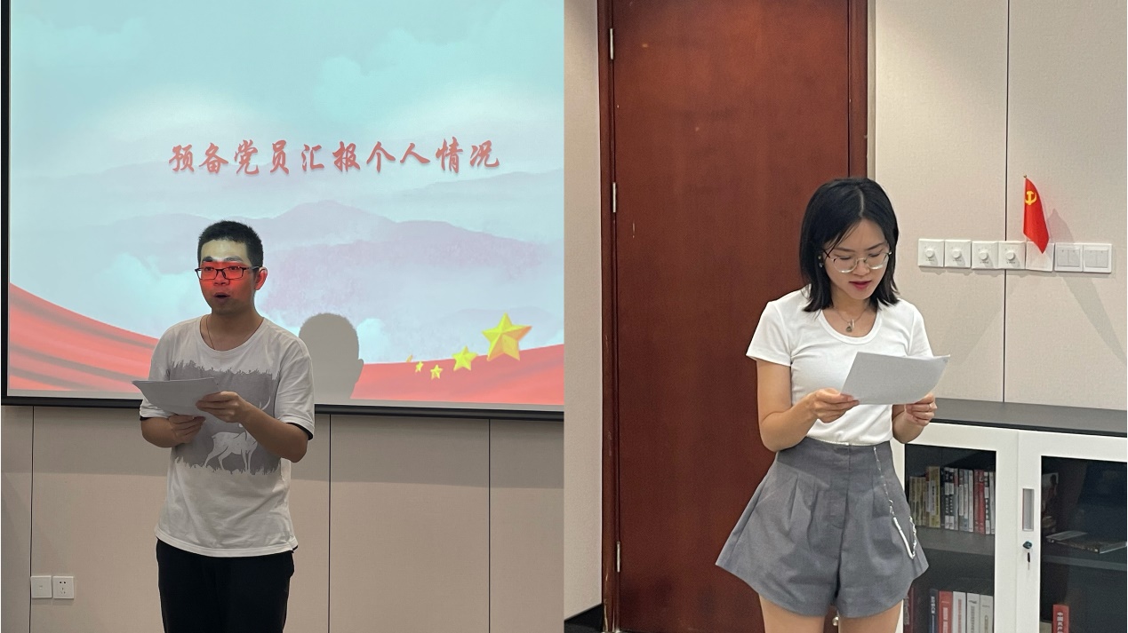 图注:预备党员陈沐(左)和韩颖(右)汇报个人情况
