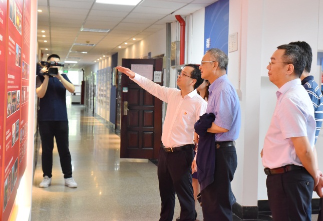 会议开始前,指导组在梅德庆陪同下参观了玉泉校区第一教学大楼文化展览,期间,梅德庆向刘永章副组长一行简要介绍了学院的发展历史以及近年来在科研、教学和党建等工作方面取得的成果。