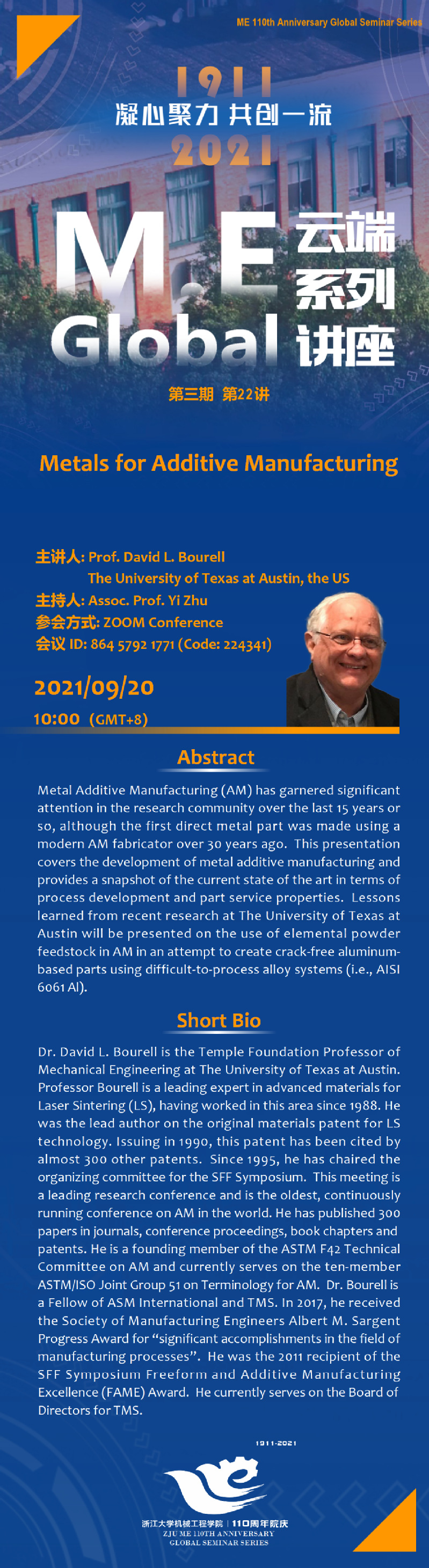 M.E Global Seminar Series第三期第二十二讲——美国得克萨斯奥斯丁分校Prof. David L. Bourell报告会的通知