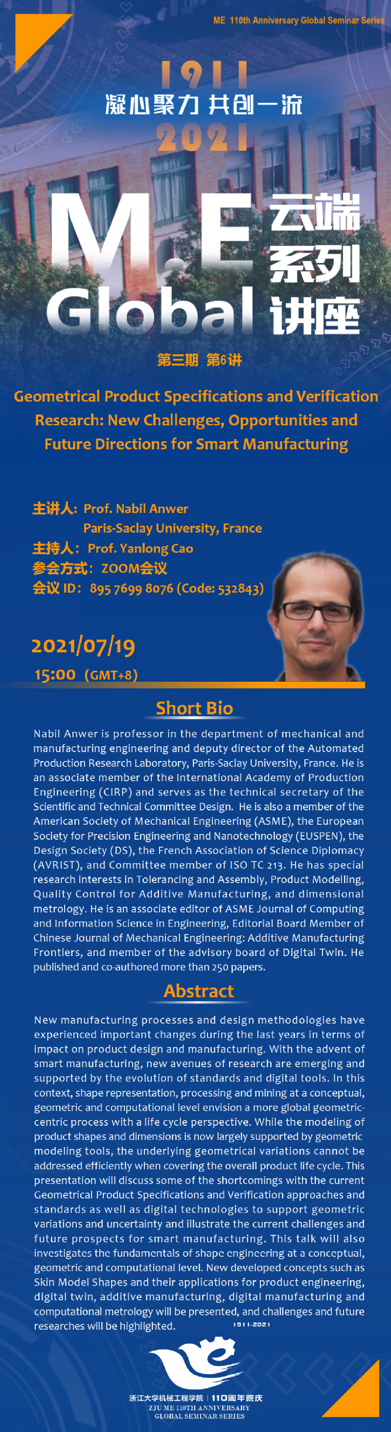 M.E Global Seminar Series第三期第六讲——法国巴黎萨克雷大学Prof. Nabil Anwer报告会的通知