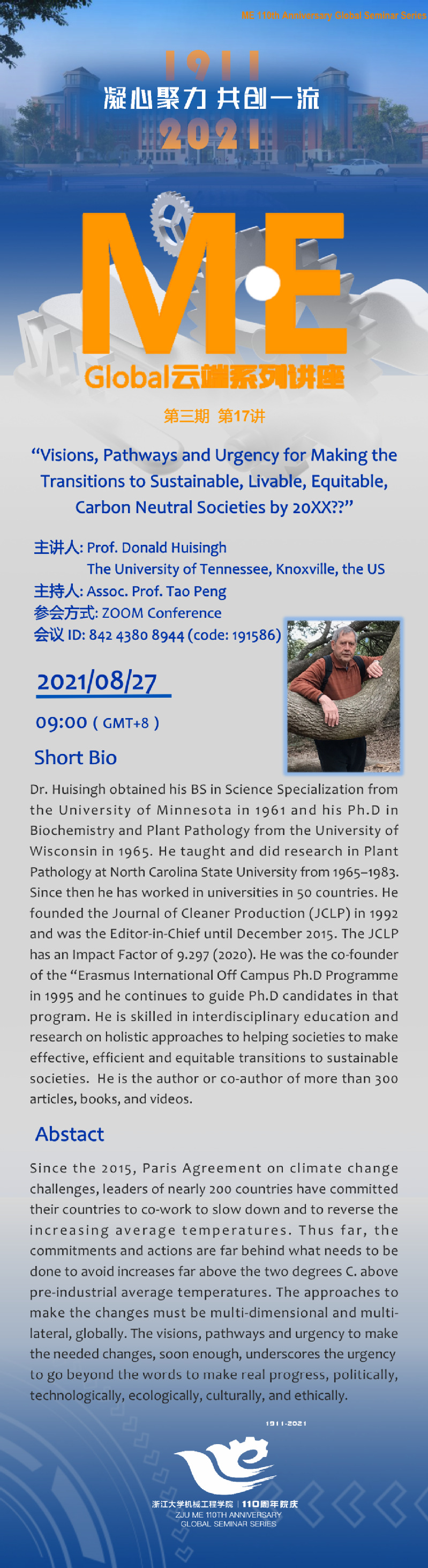 M.E Global Seminar Series第三期第十七讲——美国田纳西大学Prof. Donald Huisingh报告会的通知