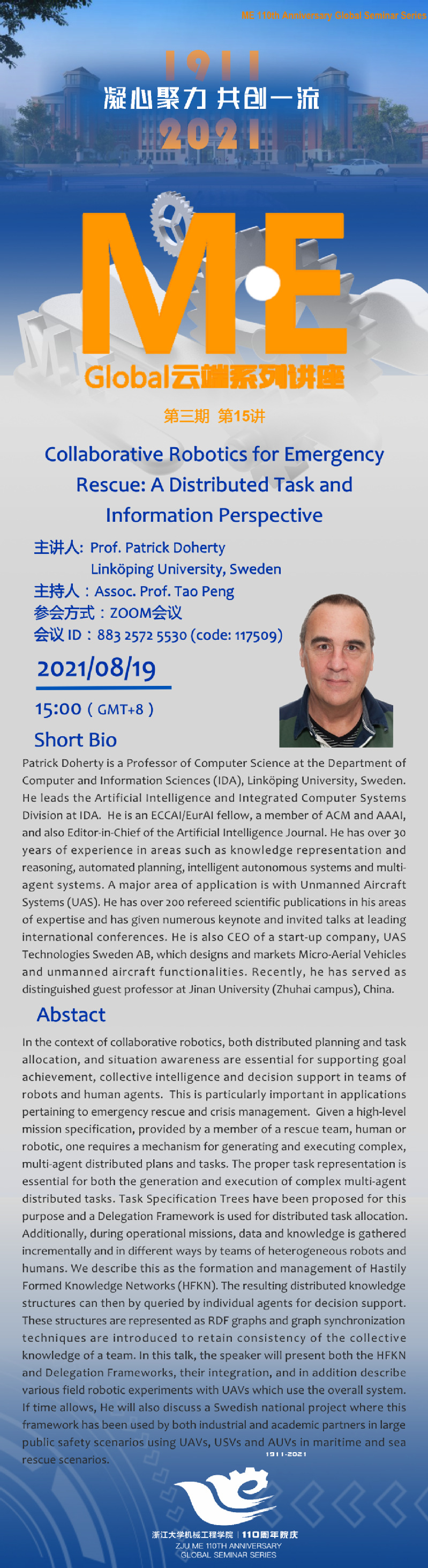 M.E Global Seminar Series第三期第十五讲——瑞典林雪平大学Prof. Patrick Doherty报告会的通知