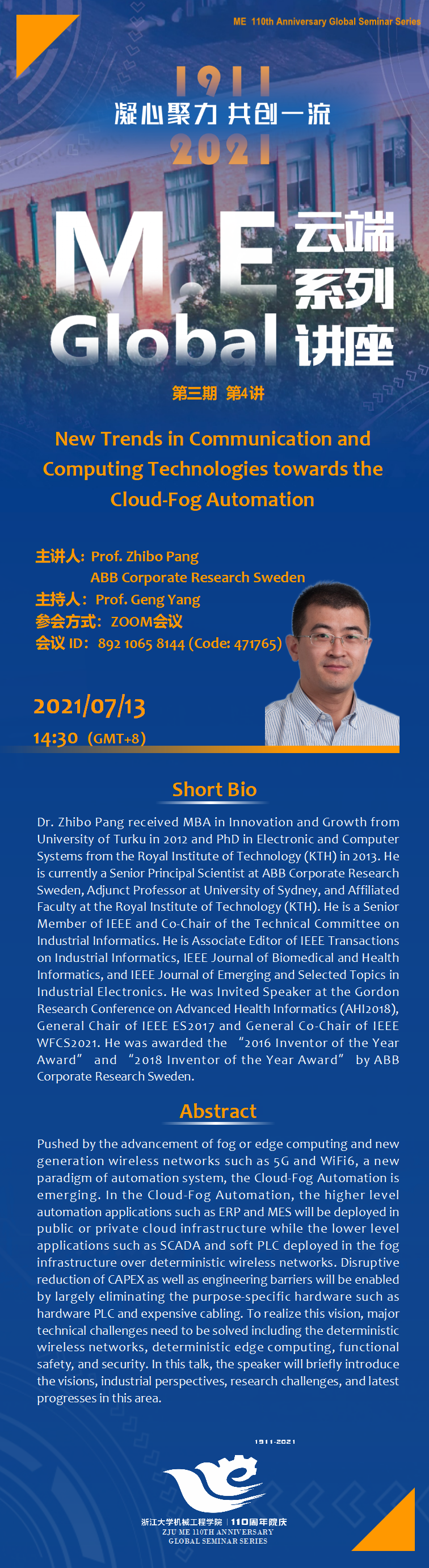 M.E Global Seminar Series第三期第四讲——瑞典ABB研究院Prof. Zhibo Pang报告会的通知
