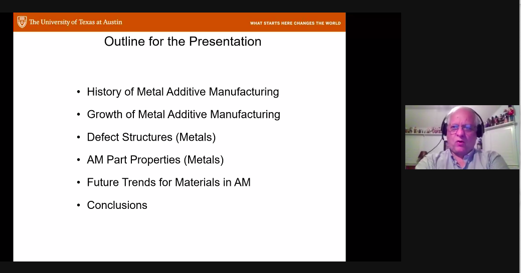 报告会伊始,Prof. Bourell介绍金属增材制造的发展历史:在过去15年左右的时间里,金属增材制造 (AM)引起了极大的关注,第一个直接金属零件是在30多年前制造商使用现代AM制造的。随后,Prof. Bourell的分享涵盖了金属增材制造的发展、工艺开发和零件服务特性方面现有技术水平等。他还分享了德克萨斯大学奥斯汀分校最近的研究成果:在AM中添加元素粉末以尝试成形难以加工的合金(如AISI 6061铝合金)。