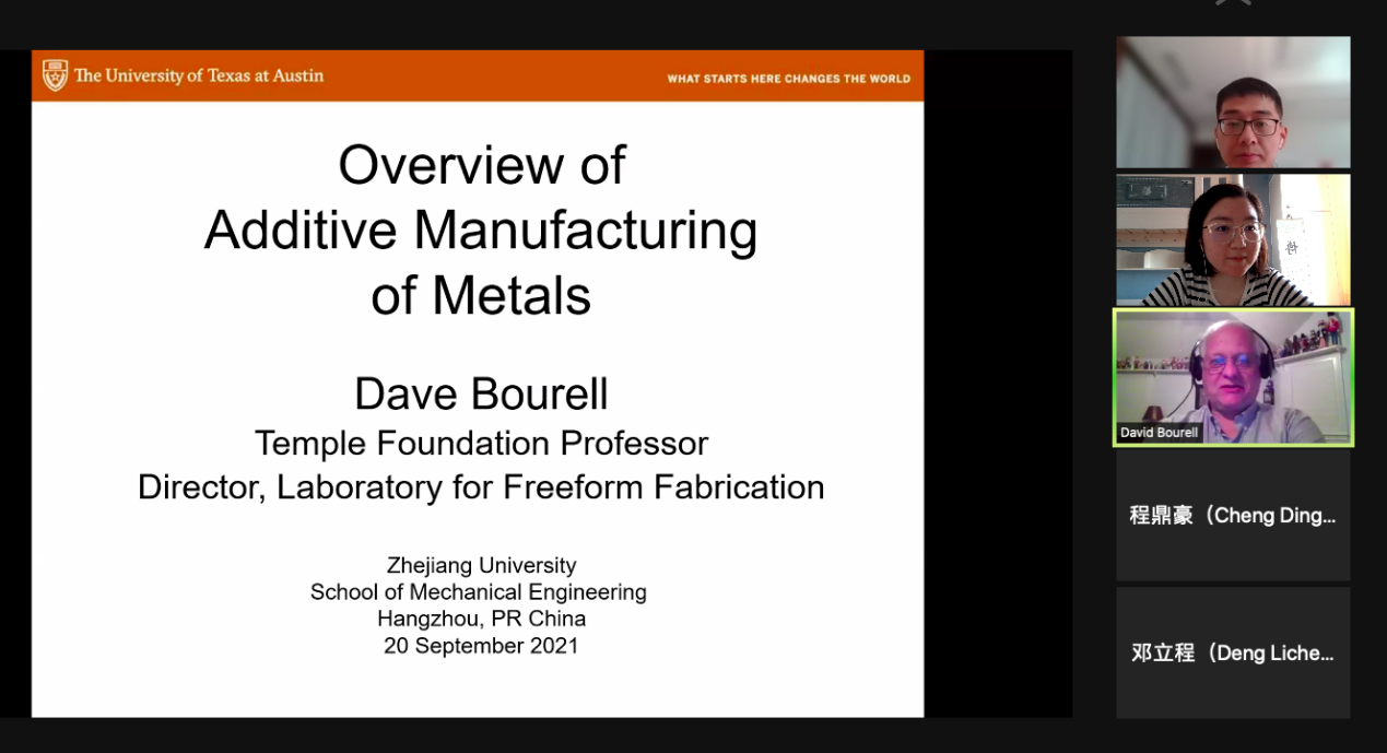 2021年9月20日,应浙江大学机械工程学院邀请,美国德克萨斯大学奥斯汀分校Prof. David L. Bourell为我院师生举行了一场线上学术报告会,主题为“Metals for Additive Manufacturing”。报告会由我院祝毅副教授主持,学院近百名师生线上参会。
