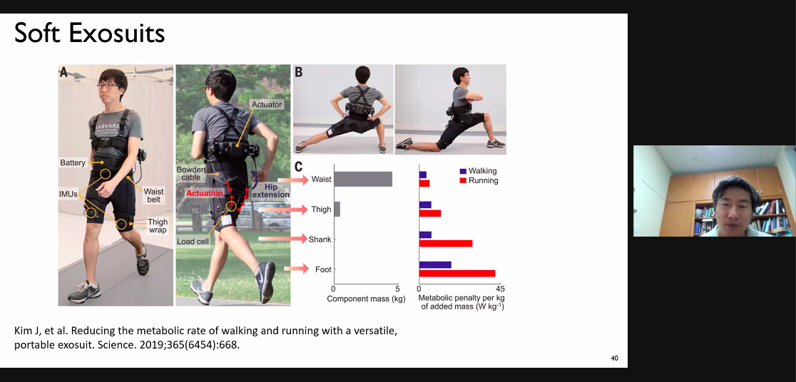 报告会伊始,Dr. Li为浙江大学机械工程学院110周年诞辰送上祝福。紧接着介绍了生物力学能量收集器和外骨骼的基本情况。外骨骼是与用户交互的设备,可以从用户获取能量或向用户输入能量。能量收集的目标是以最少的用户数量来发电,外骨骼旨在提高步行效率。有了这两个相互竞争的目标,了解用户与设备的交互变得更加重要。Dr. Li讨论了能量收集和步行辅助外骨骼,重点是两个能量收集器,并介绍设计原则和人体实验,以证明用户与设备交互在生物力学系统设计中的重要性。