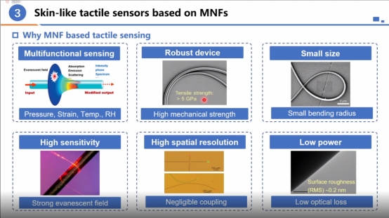 张磊教授首先讲述了光纤在微纳尺度的倏逝场效应及其用于传感的作用原理。随后,他从自己的研究工作出发,系统地介绍了面向智能机器人和生命健康领域的光流控微纳光纤传感器、触觉微纳光纤传感器的制备方法、技术特征和潜在应用。得益于强光场约束力、高倏逝场比例、低损耗、弯曲半径小等特性,微纳光纤作为触觉传感器的“人工光学神经”,具有感知参量丰富(压力、振动、微应变、温度、湿度)、灵敏度高、回复时间快和器件柔性好等优势。谭德志博士介绍了他的团队在光信息存储及处理等方面的工作。为满足大数据、人工智能等新技术对数据存储、处理的日益增长需求,团队开发了基于超低能耗单脉冲超快激光的多维光信息存储技术。通过调控局部温度场和光场,在大幅提升光信息写入速度的同时实现了长达107年的存储寿命。团队还提出热冷精密可控的超快激光加工新机制,拓展了该技术在微纳加工的应用范围。