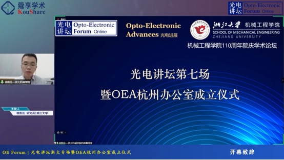 2021年9月25日,由浙江大学机械工程学院与OEA期刊(Opto-Electronic Advances,《光电进展》)杭州办公室主办的“光电讲坛第七期(浙大站)暨OEA期刊杭州办公室成立仪式”以线上直播的形式进行。本次论坛作为机械工程学院110周年院庆学术论坛之一,邀请到了新加坡工程院院士、OEA执行主编&新加坡国立大学洪明辉教授、浙江大学光电科学与工程学院张磊教授和之江实验室谭德志博士作为分享嘉宾。本场论坛通过知乎、寇享以及光电期刊微信视频进行线上直播,参会人数超1.1万人次。本次论坛由我院徐凯臣研究员主持。