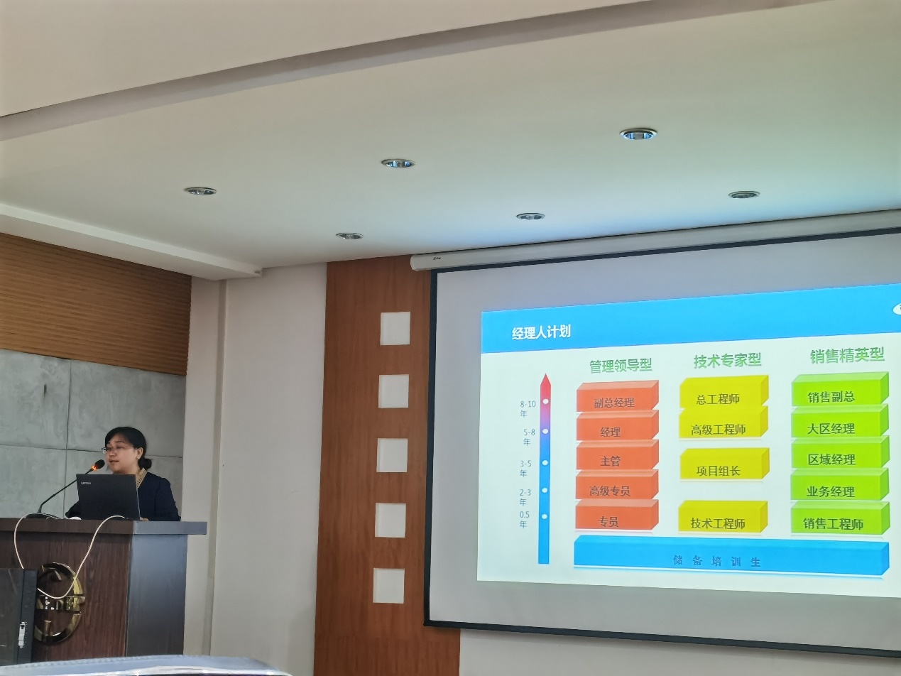 针对新员工的培养,江苏恒立液压人力资源部经理吴燕兰详细介绍了江苏恒立液压对新员工的培养计划——“经理人计划”。在同学们关心的工作生活方面,通过PPT全面展示了江苏恒立液压的住宿,以及部门定期的团建活动(羽毛球、篮球等),充分展示了企业的活力与凝聚力。在同学们最为关注的员工福利上,介绍了公司的人才待遇和住房补贴政策。在后备干部培养方面,公司着重介绍了管理领导型、技术专家型,以及销售精英型干部的培养政策。